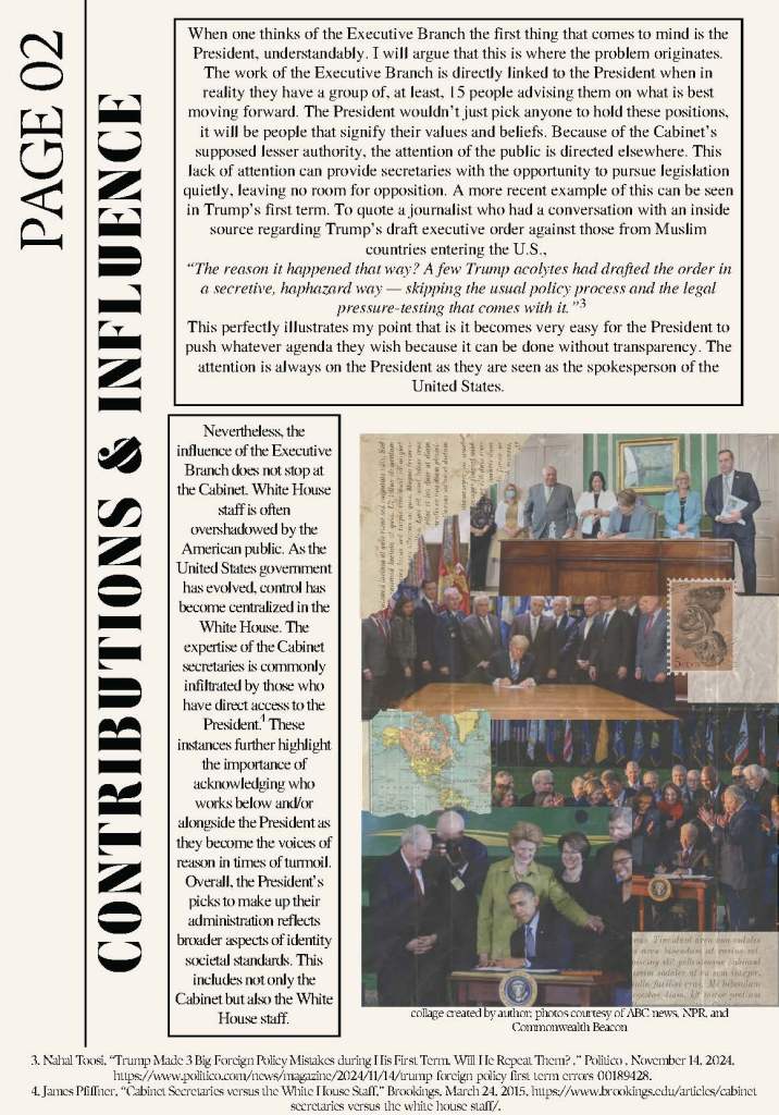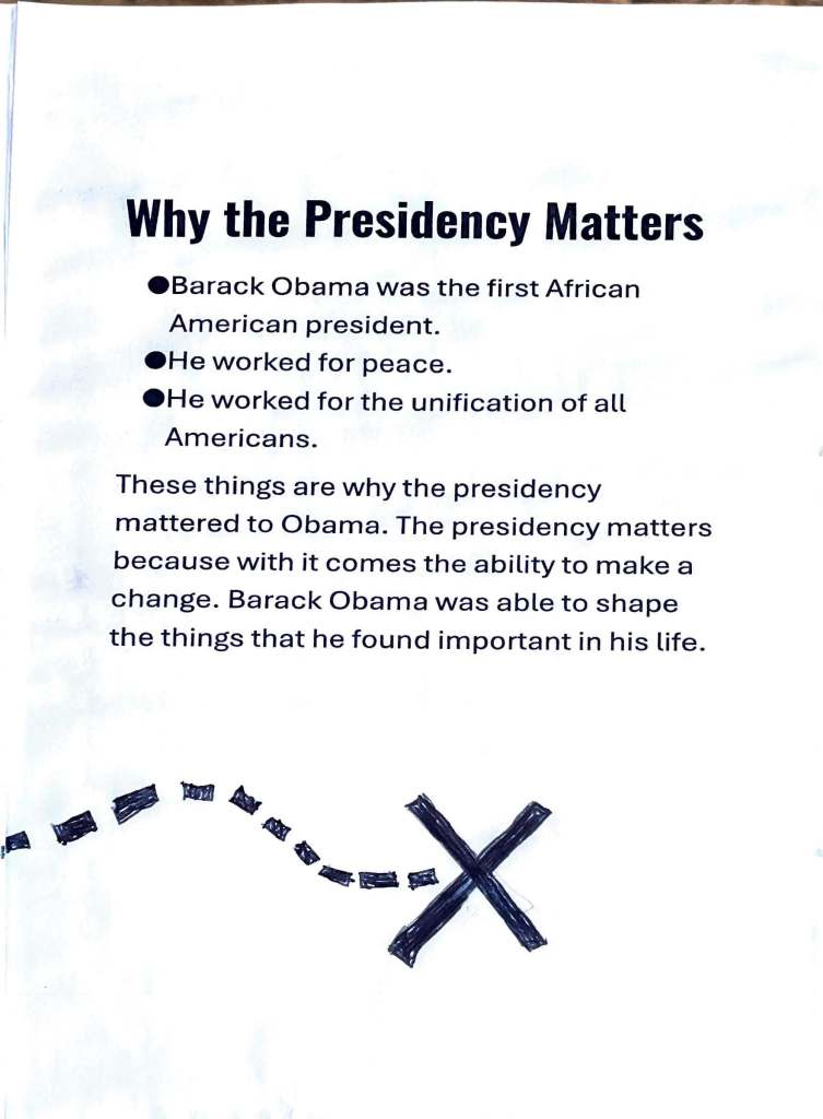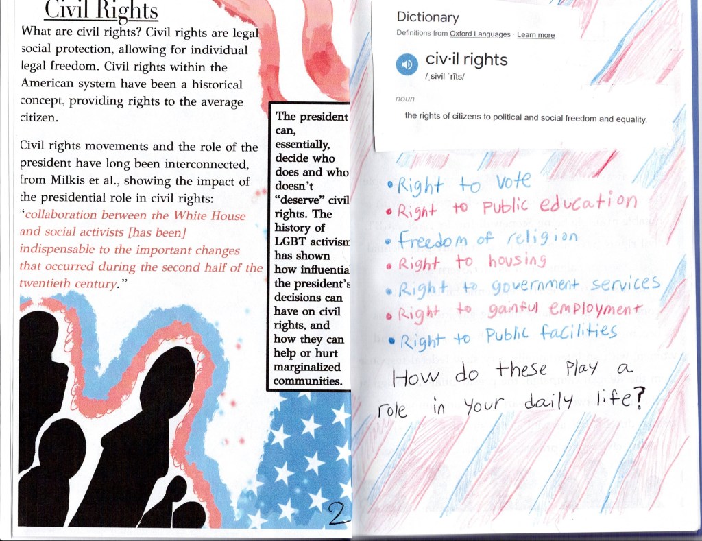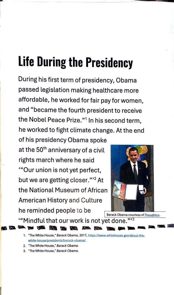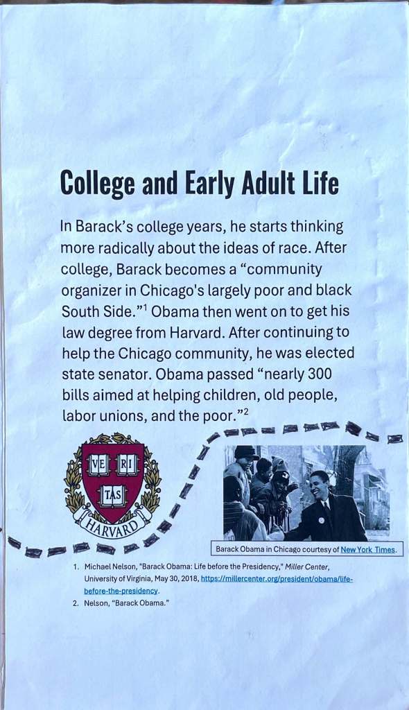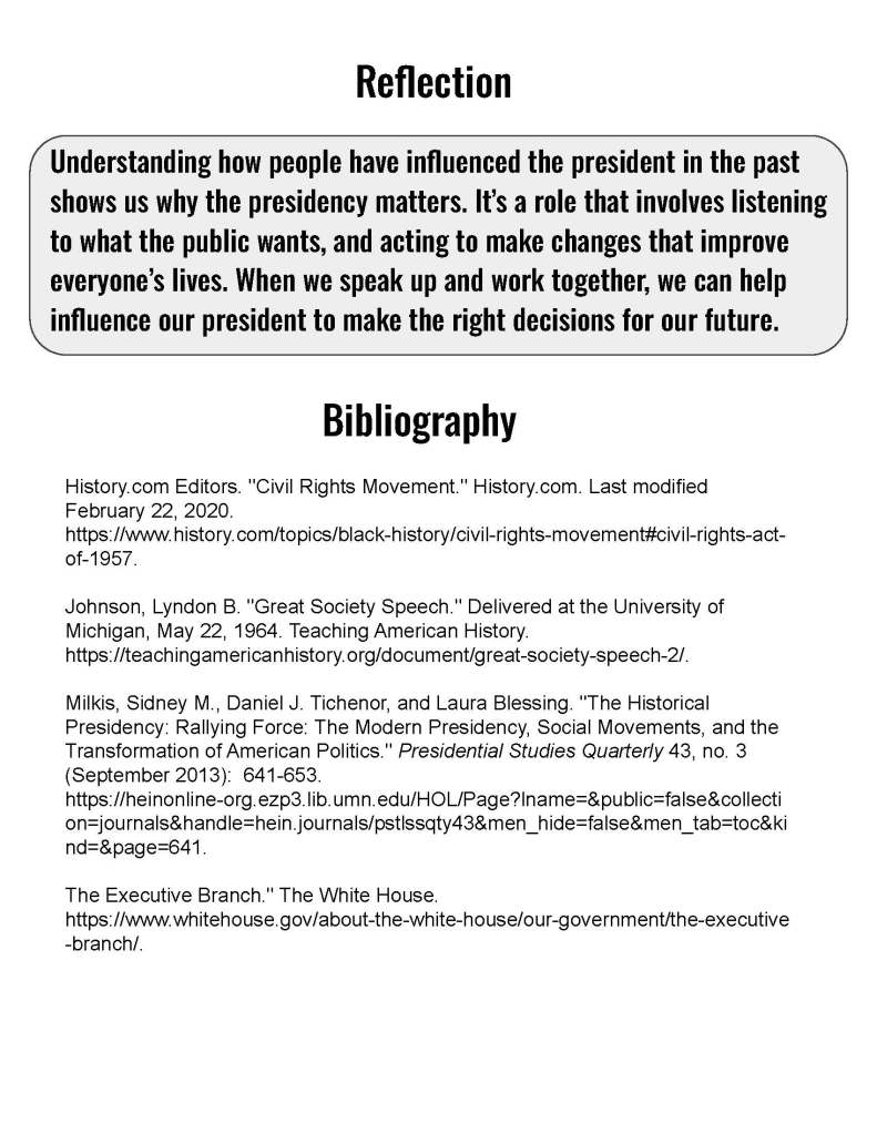 For this assignment students were asked to create a zine which responded to the question, “Why does the Presidency matter?” They were required to use two secondary sources and one primary source.